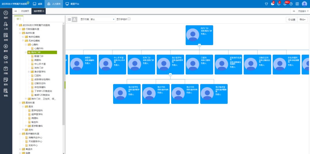 1、组织人员:实现全院组织架构的搭建与调整,人员信息数字化管理, 包括基础信息及相关附属信息的统一管理,支持人员异动线上化流程审批,并使用扫码入职功能完成线上办理入职登记等。