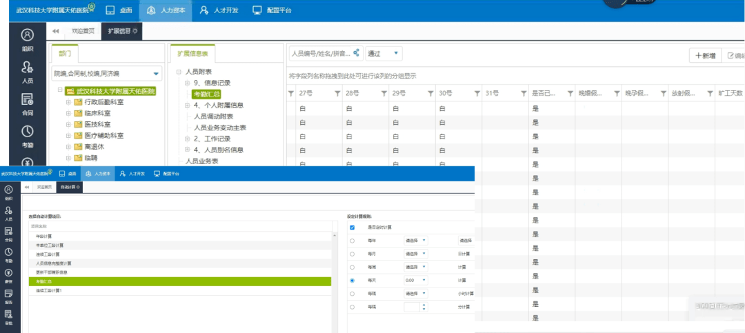2、考勤管理:实现全院按照科室为单位进行考勤排班、考勤结果统计及考勤流程的管理。